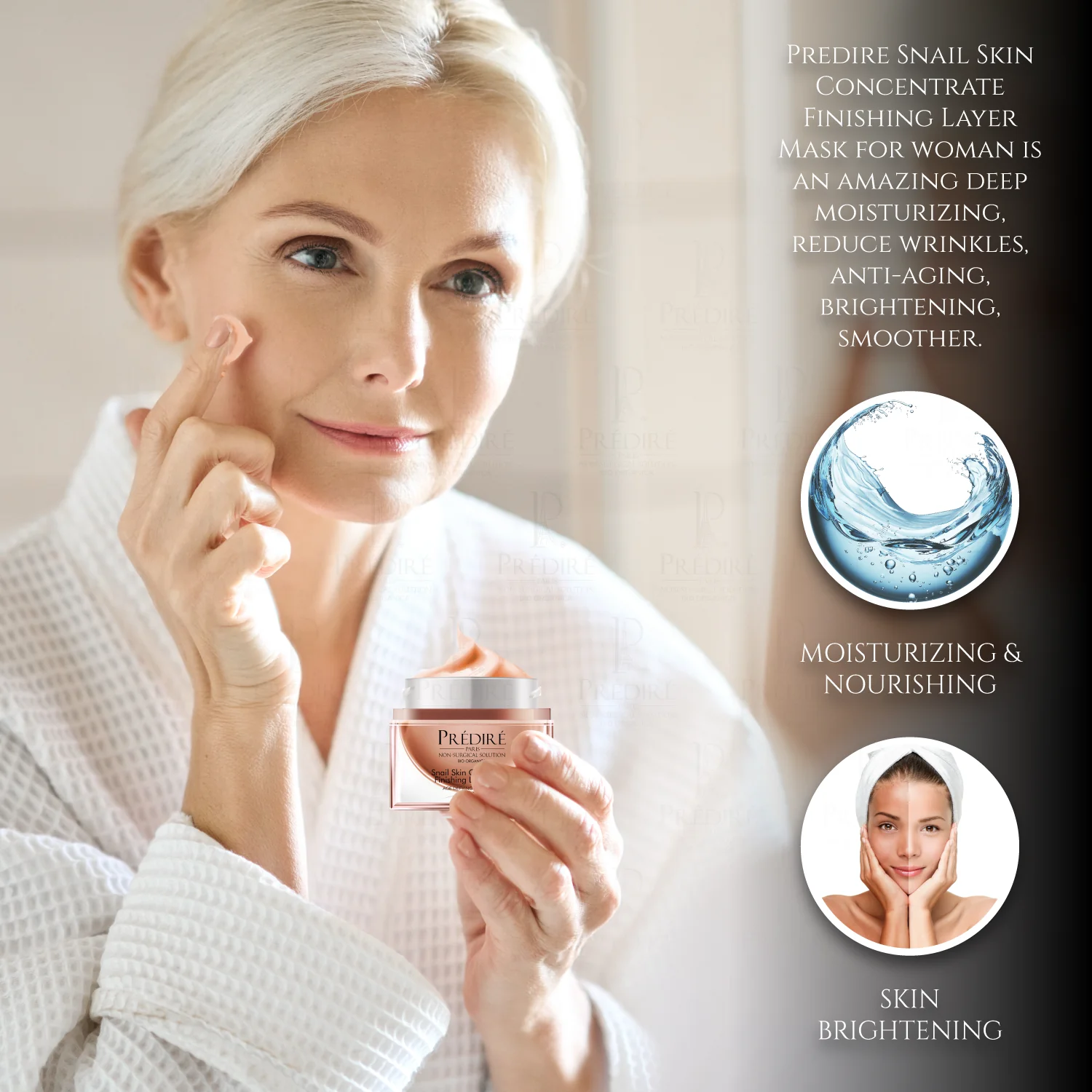 Predire Snail Skin Concentrate Finishing Layer Mask for woman is an amazing deep moisturizing, reduce wrinkles, anti-aging, brightening, smoother; Repair and solve pores problem, prevent premature skin aging like doing SPA quality treatment for a variety of skin concerns.